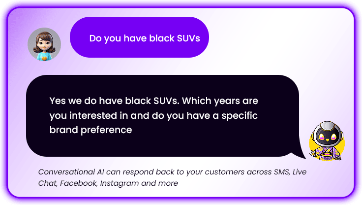 Ready to automate your customer engagement? Conversation AI can respond to customers across SMS, Live Chat, Facebook, Instagram, and more. The best part is that this AI doesn’t just respond with generic, canned answers. It learns from past conversations and training to answer your customers’ interactions more accurately. From booking appointments to qualifying leads, Conversation AI handles it all.