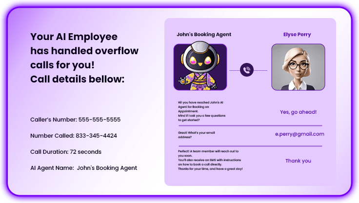 How many prospect calls do you miss in a week? 10? 25? 100? With Voice AI as your automated receptionist, you’ll never miss another call - even during off-hours. This helpful assistant answers missed calls, collects critical information, and transfers customers to human agents when necessary.